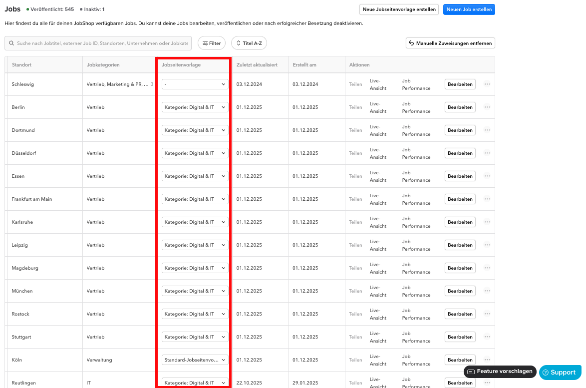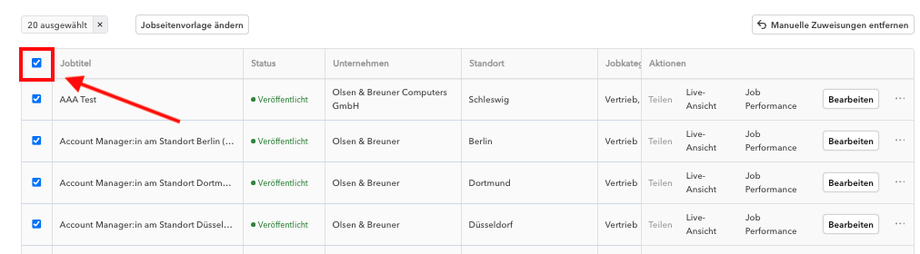 Wenn du vielen Jobs dieselbe Jobseitenvorlage zuweisen möchtest, kannst du dies gesammelt erledigen: