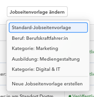 Falls noch keine passende Jobseitenvorlage existiert, kannst du jederzeit eine neue Vorlage erstellen und diese anschließend direkt einem oder mehreren Jobs zuweisen. Das geht direkt über den Button "Neue Jobseitenvorlage erstellen" oder im Auswahlfeld-Dropdown ganz unten.