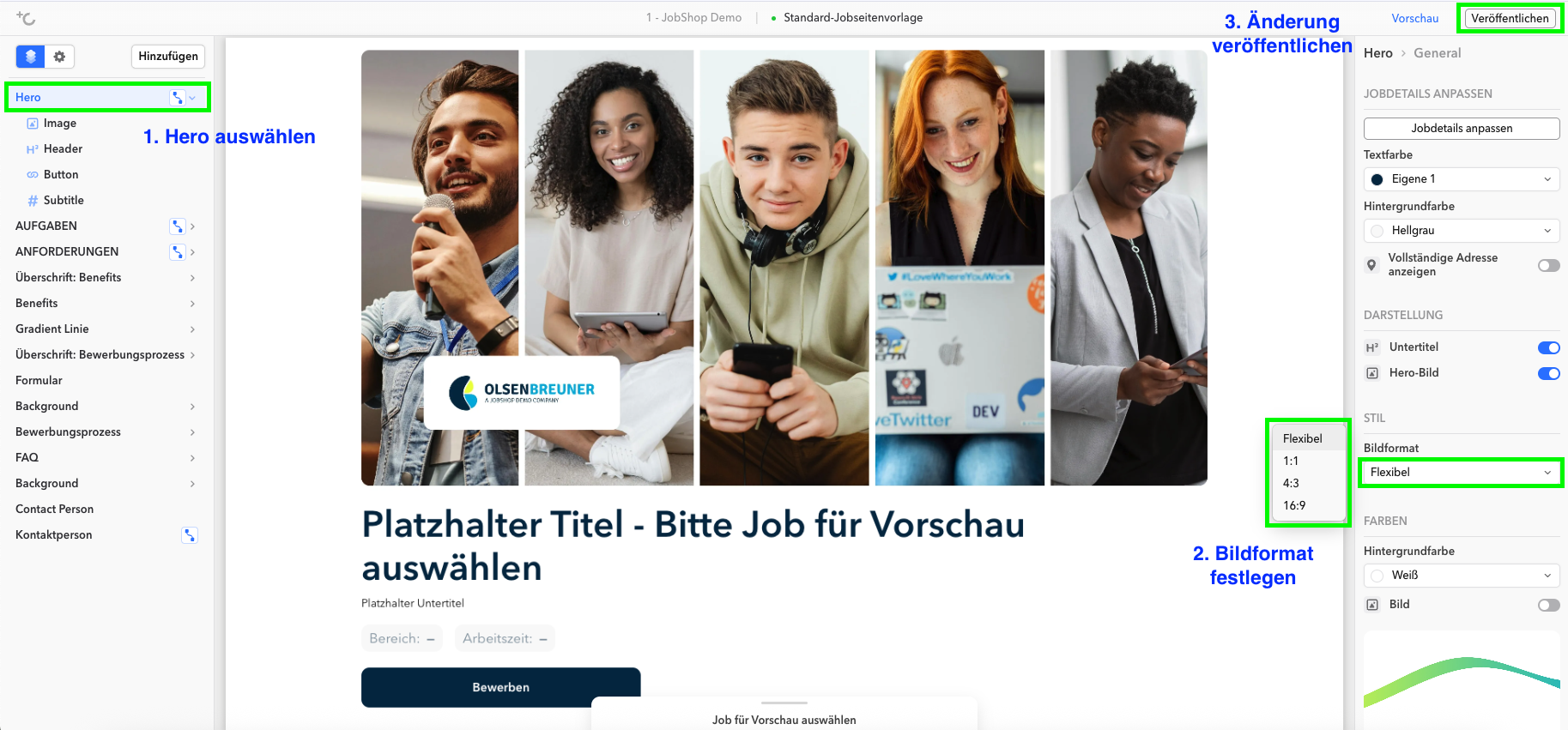 Das Hero-Modul ist dynamisch: Titel und Jobdetails ziehen sich aus dem ATS. Das Hero-Bild kann aktuell jedoch nicht dynamisch gezogen werden und muss daher statisch gepflegt werden. Das bedeutet: Für jedes unterschiedliche Hero-Bild benötigst du eine eigene Jobseitenvorlage.