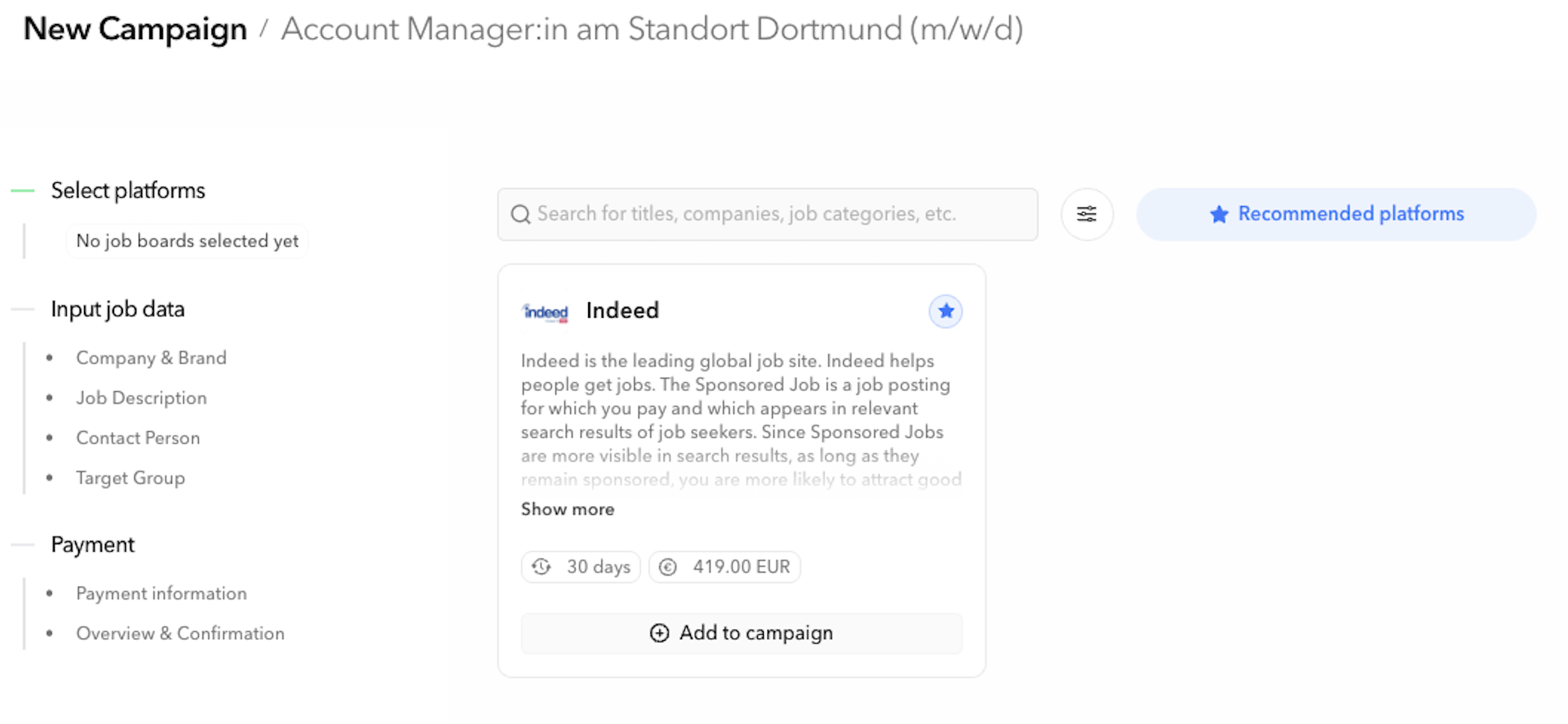 Nach dem Klick auf „Bewerben mit VONQ" öffnet sich die Kampagnenerstellung. Du siehst eine Übersicht mit empfohlenen Jobbörsen, die auf deine Stelle und Zielgruppe zugeschnitten sind.