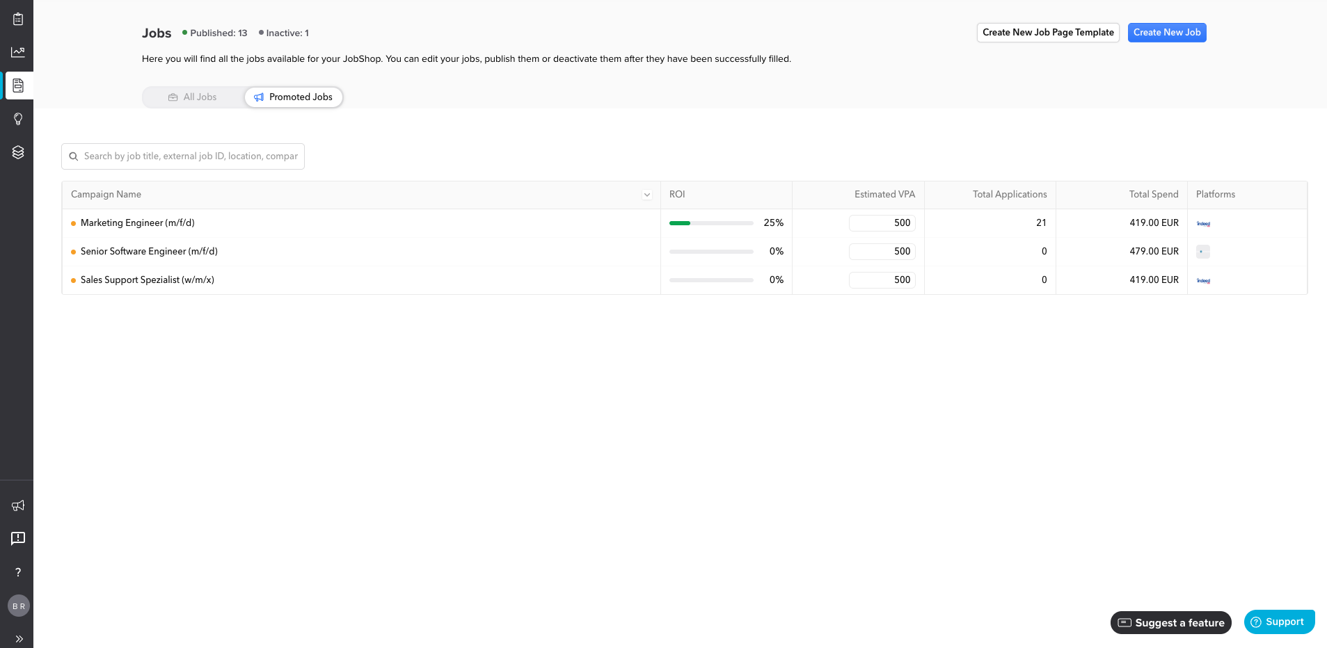 | ROI | Return on Investment – prozentualer Wert, wie gut die Kampagne performt (grüner Balken = positiv) Berechnung: Estimated Value per Application (VPA) x Anzahl der Bewerbungen der Kampagne / Gesamtkosten der Kampagne |